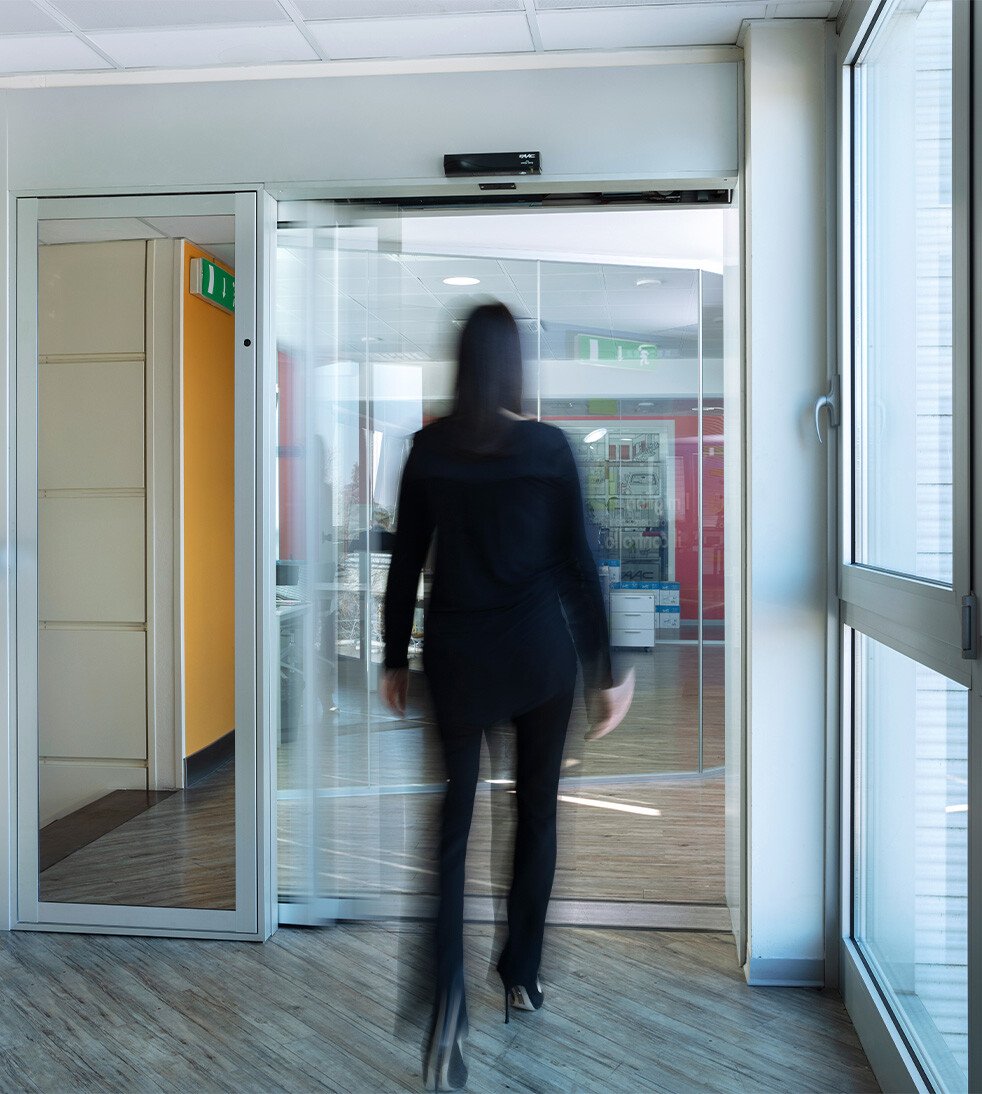 - Porte automatique à double vantail coulissant avec rideau d’air intégré (système AIRSLIDE)